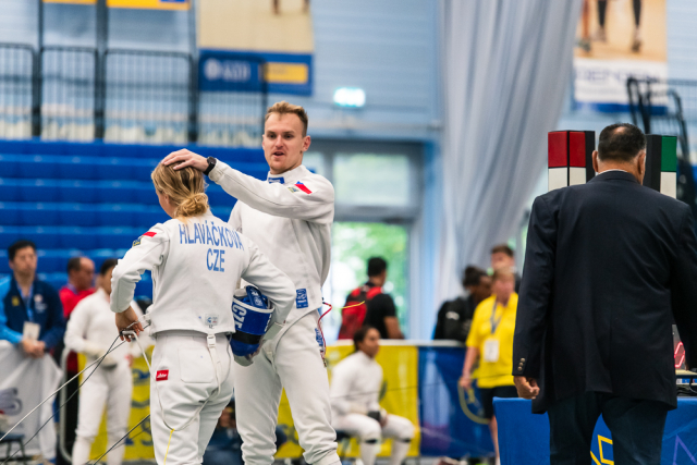 Už v úvodním šermu si oba spravili chuť z nepovedených individuálních závodů, když s výrazně aktivní bilancí 23/17 získali cenných 230 bodů. „Snažili jsme se být v pohodě a moc na sebe nevytvářet zbytečně tlak. Myslím, že jsme to dneska zvládli docela nad věcí,“ pochvaloval si Marek.„Já šerm začala strašně, tak jsem ráda, že jsem se pak z toho dokázala nějak zvednout,“ oddychla si jeho týmová parťačka. A spokojený s úvodní disciplínou byl i reprezentační trenér Jakub Kučera. „Bylo dobře, že v momentě, kdy se jednomu přestalo dařit, začalo se dařit druhému, takže si dokázali pomoct. Neměli tam tak žádnou dlouhou šňůru, kde by prohrávali, protože vždycky alespoň jeden z týmu byl úspěšný. Skvělý výsledek i uspokojivý výkon.“