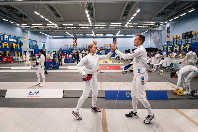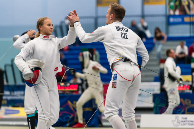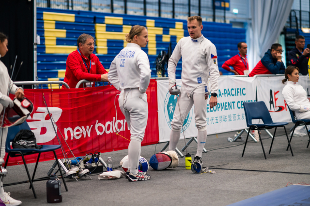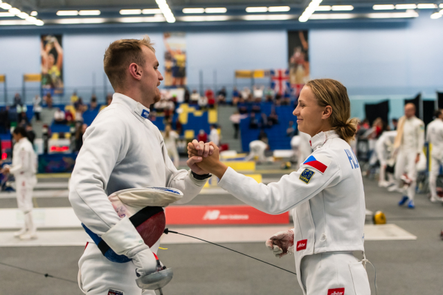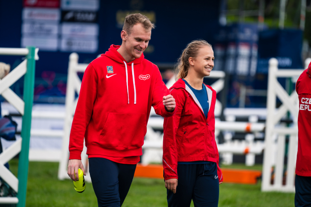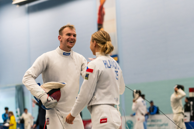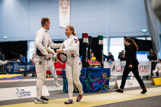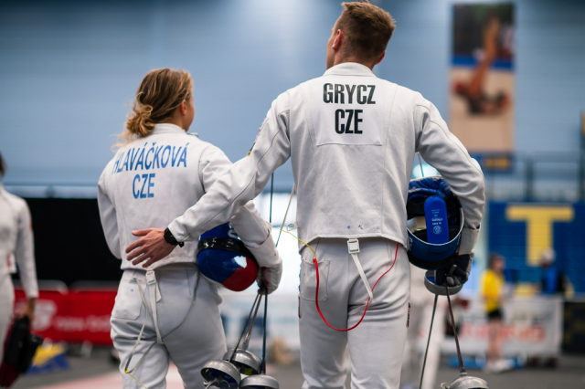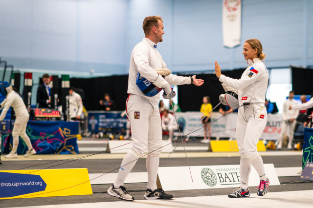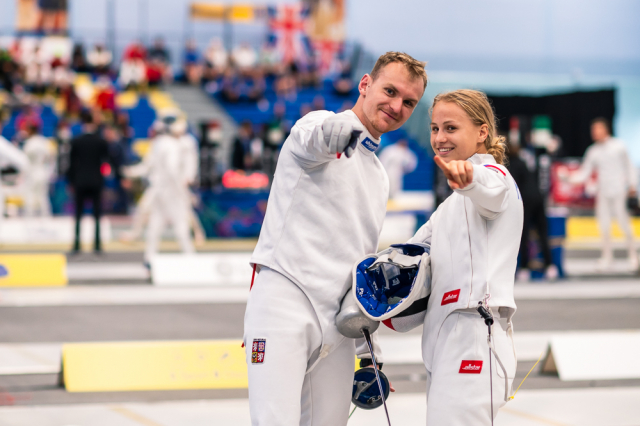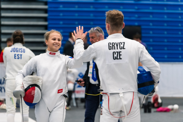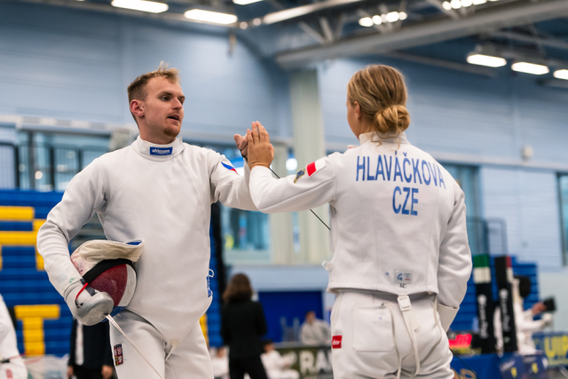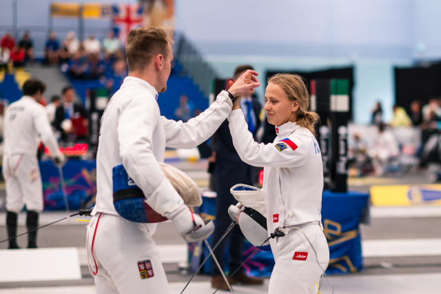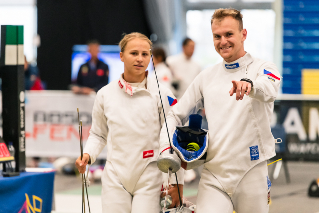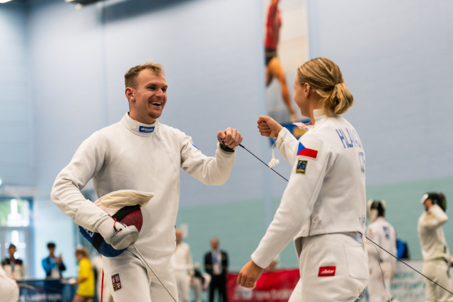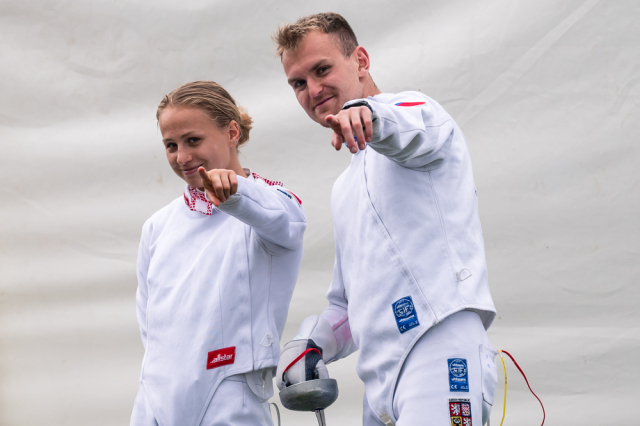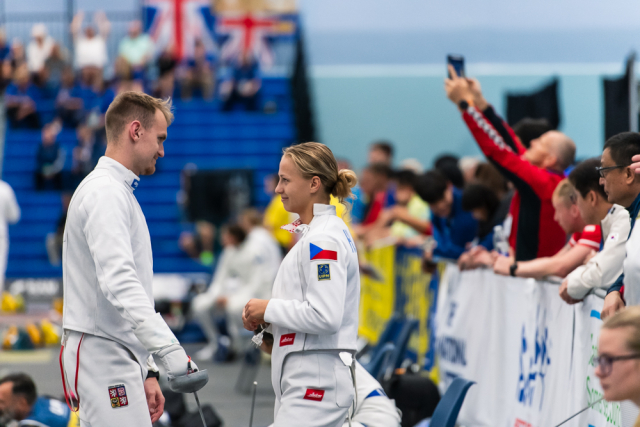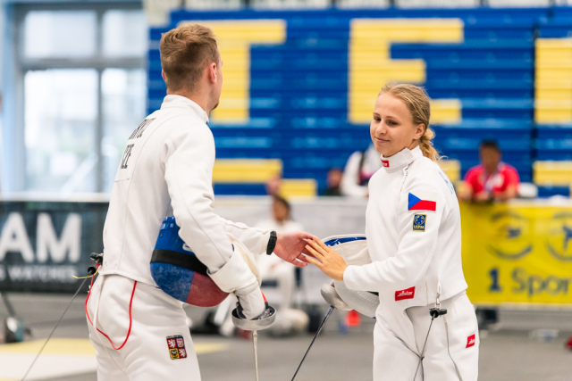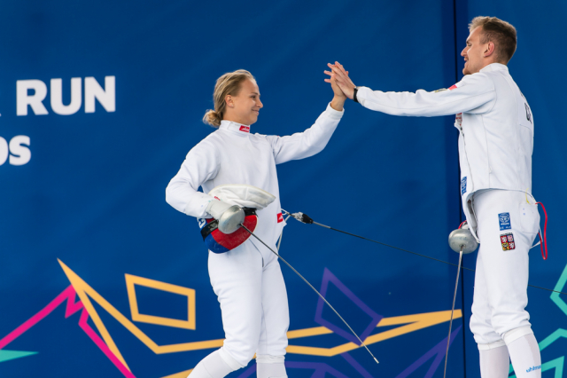 Už v úvodním šermu si oba spravili chuť z nepovedených individuálních závodů, když s výrazně aktivní bilancí 23/17 získali cenných 230 bodů. „Snažili jsme se být v pohodě a moc na sebe nevytvářet zbytečně tlak. Myslím, že jsme to dneska zvládli docela nad věcí,“ pochvaloval si Marek.„Já šerm začala strašně, tak jsem ráda, že jsem se pak z toho dokázala nějak zvednout,“ oddychla si jeho týmová parťačka. A spokojený s úvodní disciplínou byl i reprezentační trenér Jakub Kučera. „Bylo dobře, že v momentě, kdy se jednomu přestalo dařit, začalo se dařit druhému, takže si dokázali pomoct. Neměli tam tak žádnou dlouhou šňůru, kde by prohrávali, protože vždycky alespoň jeden z týmu byl úspěšný. Skvělý výsledek i uspokojivý výkon.“
