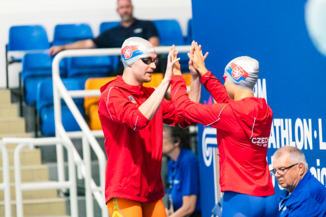 V plavání se česká dvojice posunula na průběžnou třetí příčku. A kdy začali Češi věřit, že by na medaili mohli dosáhnout? „Já začal věřit hned, když jsem zjistil, že jdu štafetu s Luckou,“ vtipkoval Marek Grycz. „Tak já teda asi až co jsme vylezli z bazénu a šli na třetí stav,“ smála se Lucie Hlaváčková. „Že jsme se posunuli plaváním na třetí místo, jsem vůbec nevěděla. Tam jsem si říkala, že bychom to mohli udržet.“